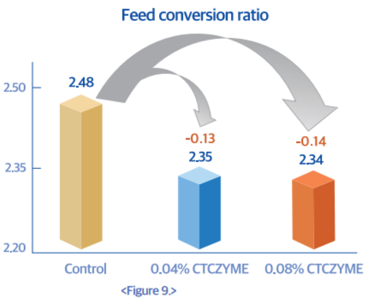육계사료내 CTCZYME 0.1% 첨가는 일당증체량 (38 vs. 35 g/d) 및 사료요구율(1.85 vs.1.99)을 개선(Yang et al., 2019).