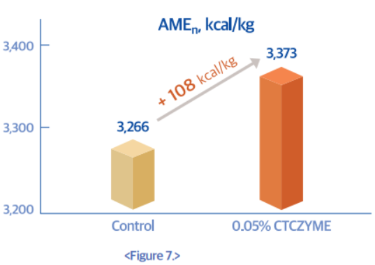 육계사료내 CTCZYME 0.05% 첨가는 사양성적, 질소보정 외관상 대사에너지, 질소축적량, 및 아미노산 소화율을 개선시킴 (Ferreira et al., 2016).